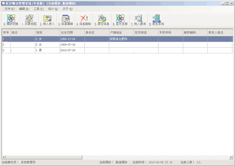 詳細的記錄和(hé)管理(lǐ)患者的聯系人(rén)資料,包括患者姓名、性别、年齡、單位、地址、電(diàn)話(huà)及聯系人(rén)電(diàn)話(huà),與患者關系等基本資料。同時(shí)具有(yǒu)記錄病人(rén)的住院資料、感染培養資料、手術(shù)資料、随訪資料。方便醫(yī)生(shēng)醫(yī)療記錄和(hé)查詢分析患者的治療康複信息,更貼心的改善患者的關系。
